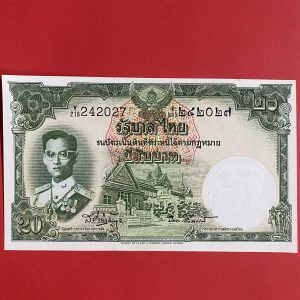 ธนบัตรแบบ 9 20 บาท รุ่นที่ 6 ประกาศใช้ 27 สิงหาคม 2501 ลายเซ็น ส.วินิจฉัยกุล - ป๋วย อึ๊งภากรณ์ พิมพ์ บริษัท โทมัส เดอ ลา ลู
