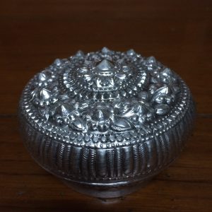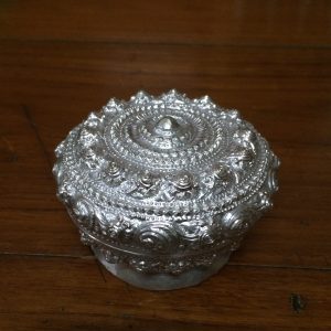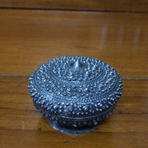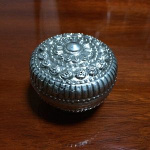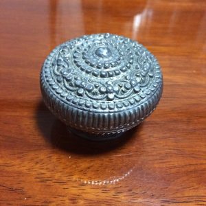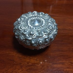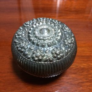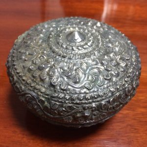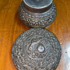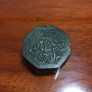 ตลับทองเหลืองจีนโบราณ มีแกะสลักลวดลายรูปและภาษาจีน โดยรอบสวยงามสมบูรณ์