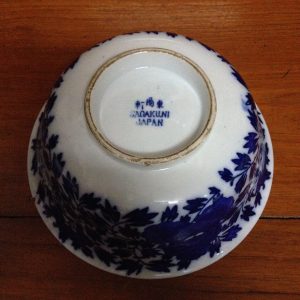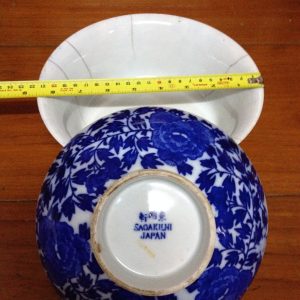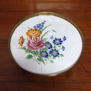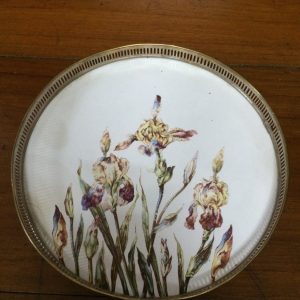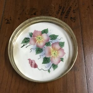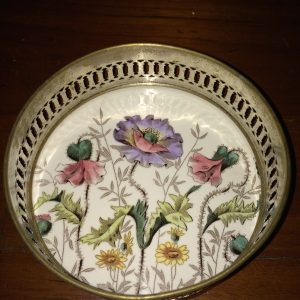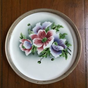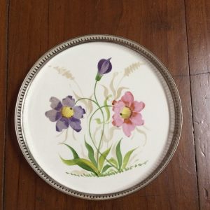 ถาดกระเบื้องโบราณตอกปีค.ศ. 1742 ด้านหลังตรงกับ สมัยพระเจ้าบรมโกษฐ์ ก่อนพระนางเจ้า วิคตอเรีย ขนาด 5-5/8" ลายดอกไม้สมบูรณ์มาก