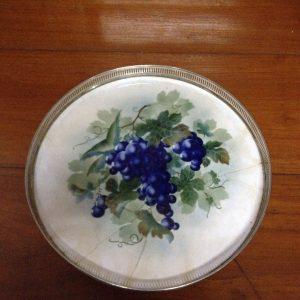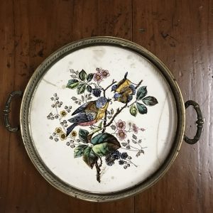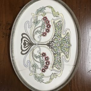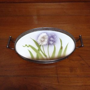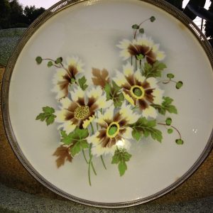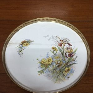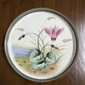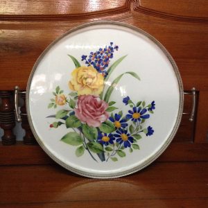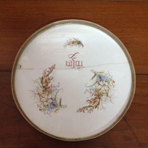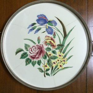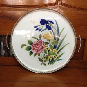 ถาดกระเบื้องโบราณกลมสมัย ร.5 ขนาด สผ.14" ดอกสไตล์ “วิคตอเรีย” มีร้าวอยู่ครึ่งเส้น นอกนั้นสมบูรณ์มาก