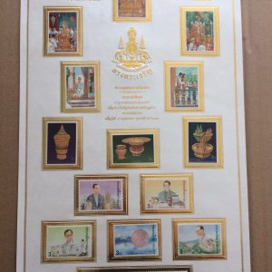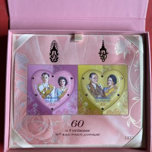 แสตมป์ ชีท 60 ปี ราชาภิเษกสมรส รูปคู่ในหลวงรัชกาลที่ 9 พร้อมราชินี อยู่ในกล่องเดิมสีชมพู