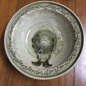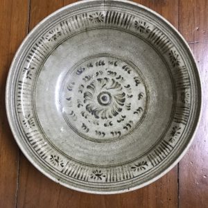 ชามสังคโลกสุโขทัย ลายรื้วตรงกลาง ที่ปีก มีเขียนลายโดยรอบสวยงาม สมบูรณ์สวยงาม