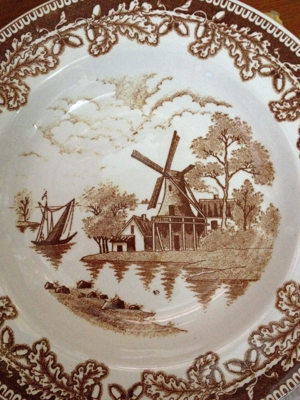 จานกระเบื้องเก่าญี่ปุ่น รูปวิวกังหันสีขาว น้ำตาล สวยงามมากๆ