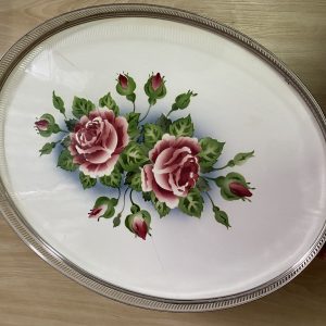 ถาดกระเบื้องเก่ารูปไข่สมัยร.5 ผลิตจากต่างประเทศลายดอกกุหลาบสีแดงขาวบานใหญ่ 2 ดอก,ตูม 12 ดอก ขนาด 18"ร้าว1เส้นบางมาก