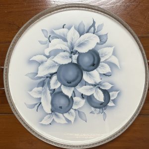ถาดกระเบื้องโบราณแบบหายากไม่มีปีกขอบ ขนาด 12 "ลาย พวงช่อองุ่นพร้อมก้านและใบ สีขาวฟ้า จับขอบพร้อมหูและดุมขา