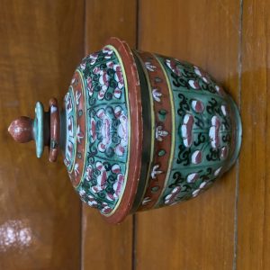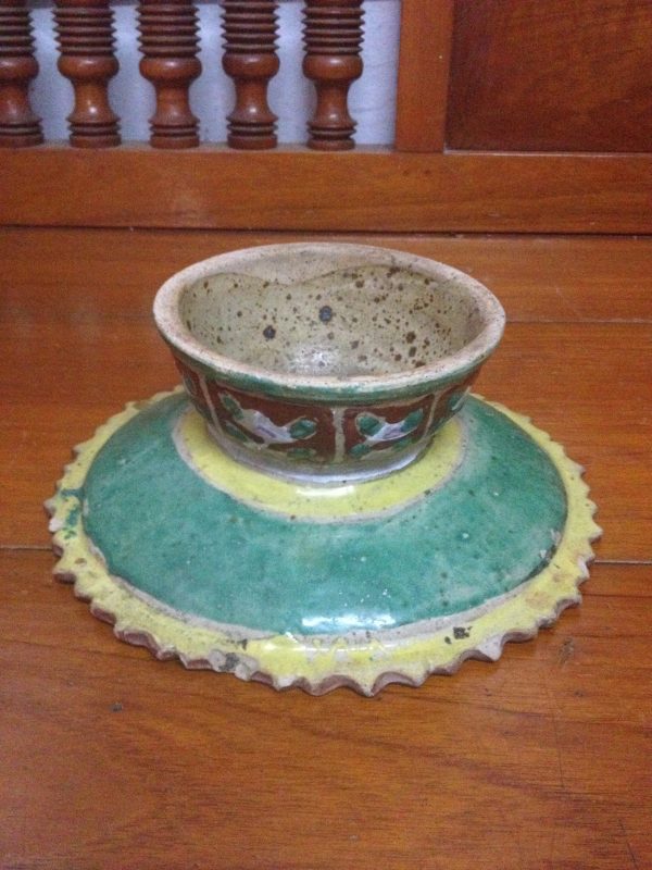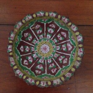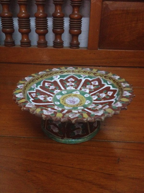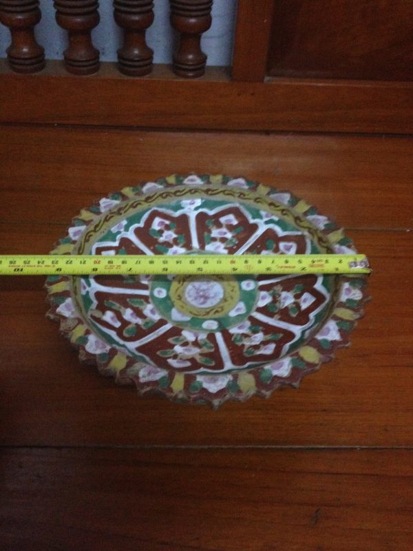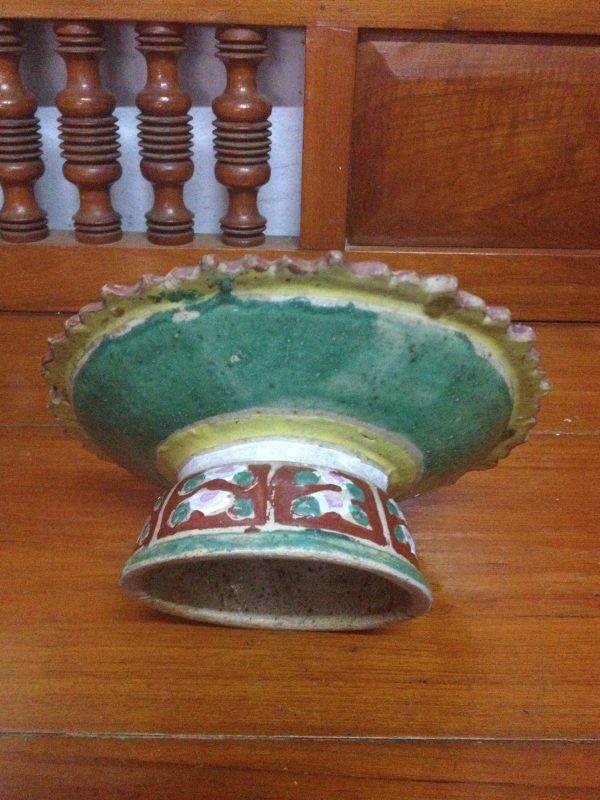จานเชิงโบราณเก่าสมัยอยุธยาสีแดงเขียวใบใหญ่ สภาพสมบูรณ์ไม่มีการซ่อมเลย ปีกกะเทาะเล็กน้อยแทบไม่เห็น (สผ.ขนาด 9″เศษ)
