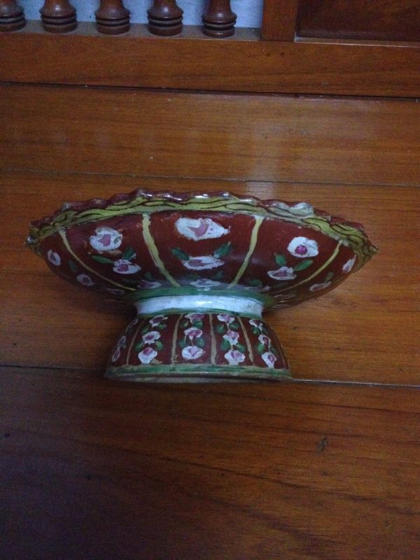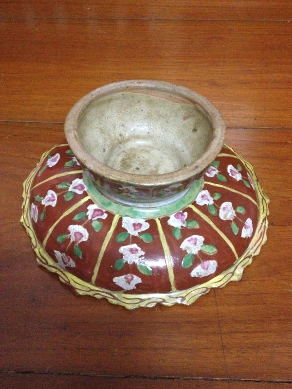 จานเชิงโบราณเก่าสมัยอยุธยาสีแดงเขียวใบใหญ่ลายดอกกระจกเล็ก สวยงาม (สผ.ขนาด 8″ครึ่ง)