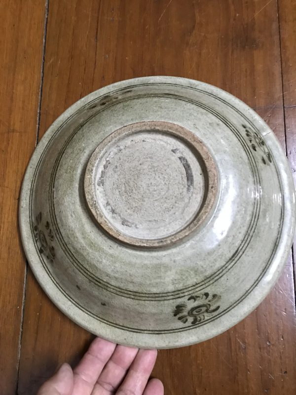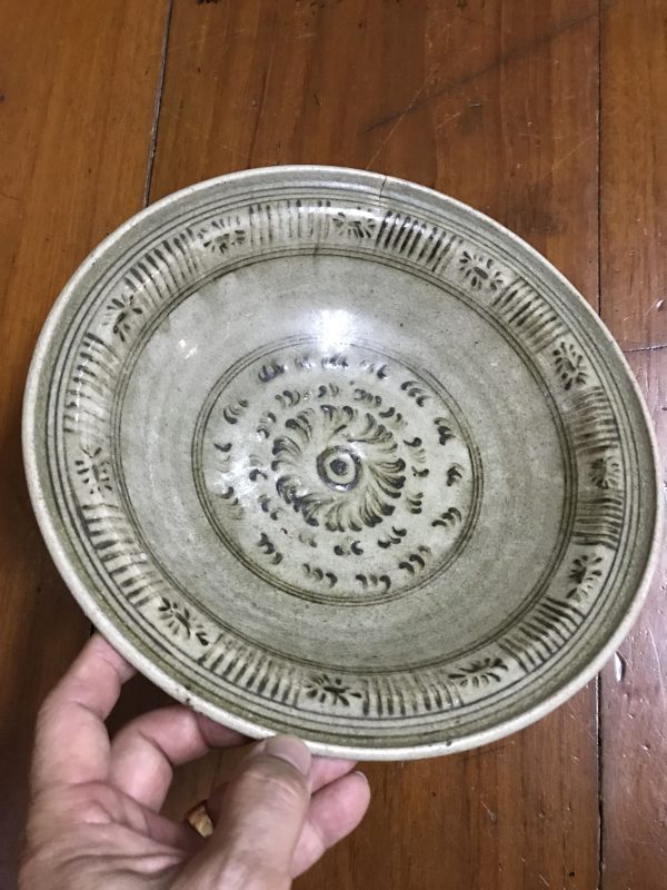 ชามสังคโลกสุโขทัย ลายรื้วตรงกลาง ที่ปีก มีเขียนลายโดยรอบสวยงาม สมบูรณ์สวยงาม