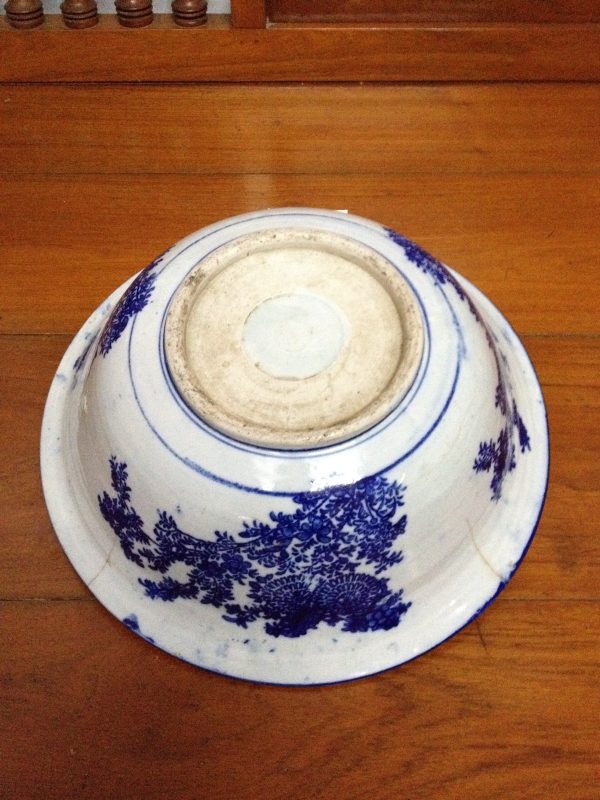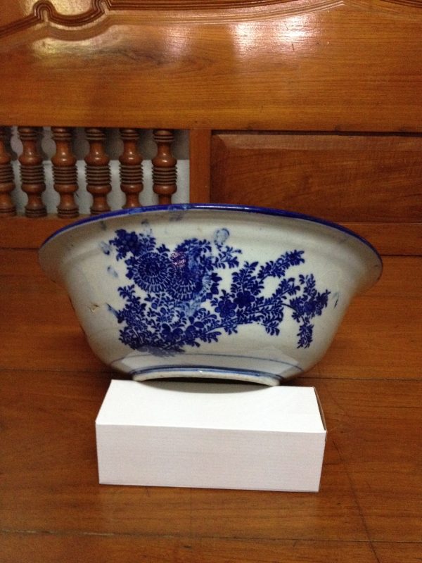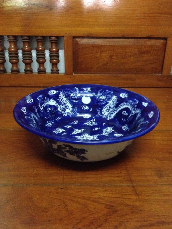 ชามอ่างกระเบื้องโบราณพื้นน้ำเงินลายมังกรสีขาวสี่ตัว มีเส้นที่ปากสองเส้น นอกนั้นสมบูรณ์สวยงามมาก (สผ 15″x สูง 5″)