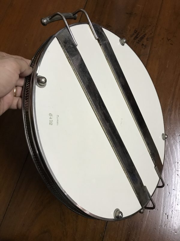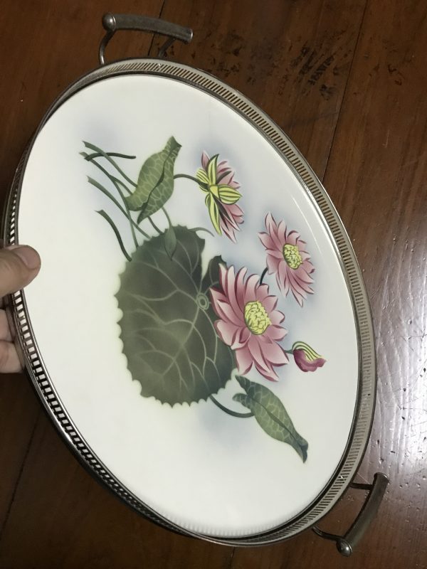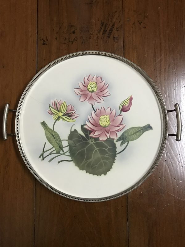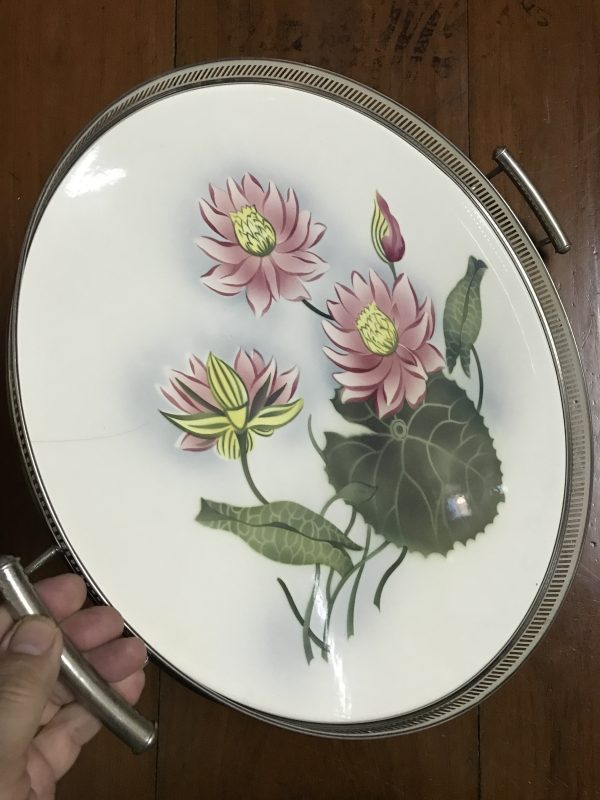 ถาดกระเบื้องโบราณกลมขนาด สผ 16″ ลายดอกบัวสีชมพู บาน 3 ดอกตูม 1 ดอก มีรอยเส้นเล็กน้อยยาว2 1/2” นอกนั้นสภาพสมบูรณ์