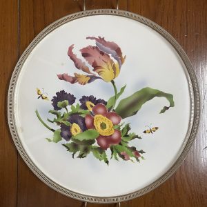 ถาดกระเบื้องโบราณขนาด สผ 18″ ลายดอกกุหลาบสีชมพูใหญ่ 1 ดอกทิวลิปเหลือง 1 ดอกและรวมช่อนำ้เงินเหลืองสมบูรณ์สวยงามมากๆ