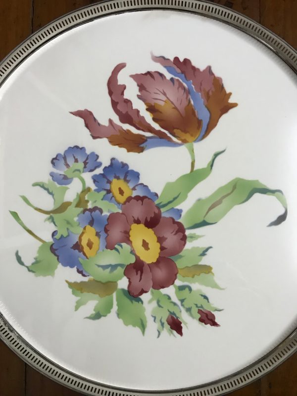 ถาดกระเบื้องโบราณกลมสมัย ร.5 ขนาด สผ.14" ดอกสไตล์ “วิคตอเรีย” มีร้าวอยู่ครึ่งเส้น นอกนั้นสมบูรณ์มาก