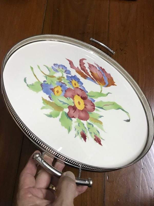 ถาดกระเบื้องโบราณสมัยร .5 ขนาด สผ 16″ สไตล์”วิคตอเรีย”ลายดอกเต็มสีชมพูบาน 2 ดอกตูม 2 ดอกนำ้เงิน 3 ดอก