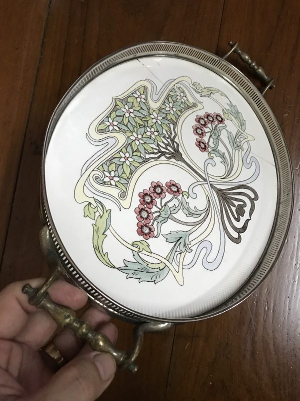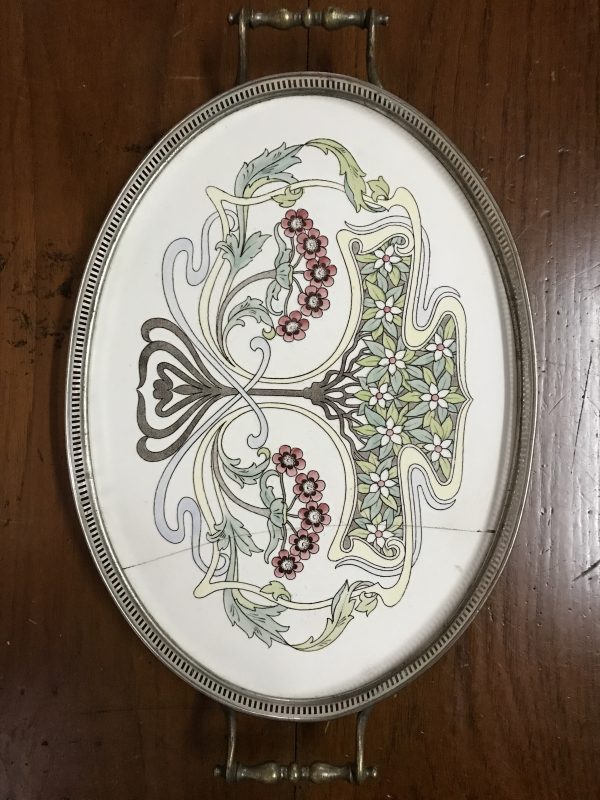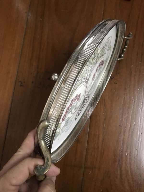 ถาดกระเบื้องโบราณ รูปไข่ขนาด 10″X14″ดูจากปีด้านหลังจะตรงกับพ.ศ.2257 สมัยของพระเจ้าอยู่หัวท้ายสระ สภาพเดิมมีร้าวอยู่หนึ่งเส้น
