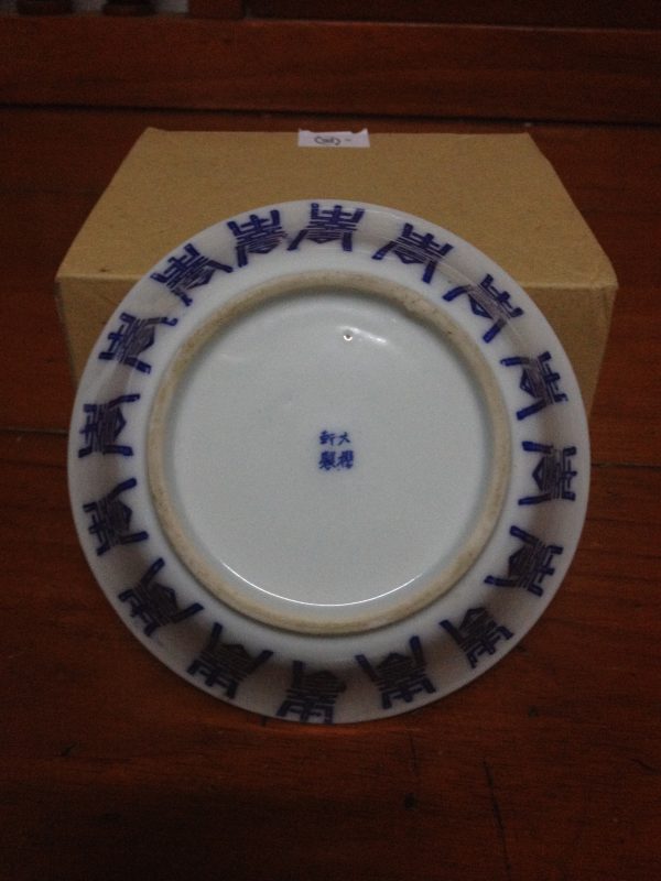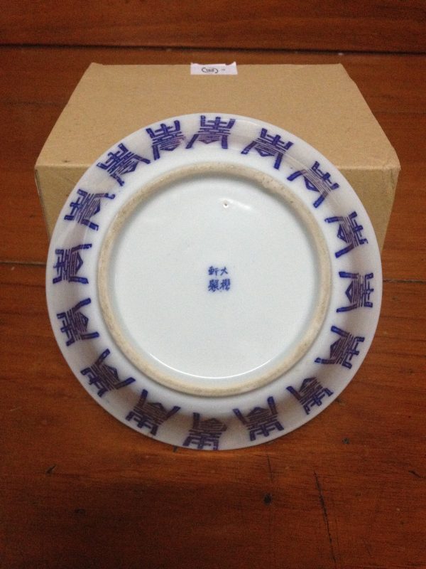 ถ้วยกังใสเนื้อแกร่งโบราณขาวฟ้า ลายภาษาจีน มีรอยร้าวหนึ่งเส้น ไม่ผ่านการซ่อม
