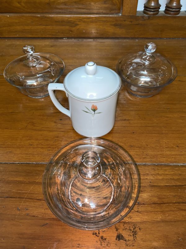 ถ้วยแก้ใสไว้ใส่ขนมหวานเก่าโบราณสำหรับไปวัดตักบาตรพร้อมฝารวม3 ใบ และถ้วยนำ้เก่าพร้อมฝา1ใบ เก็บได้สมบูรณมากๆ