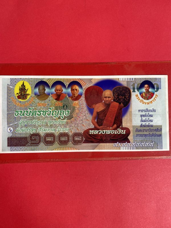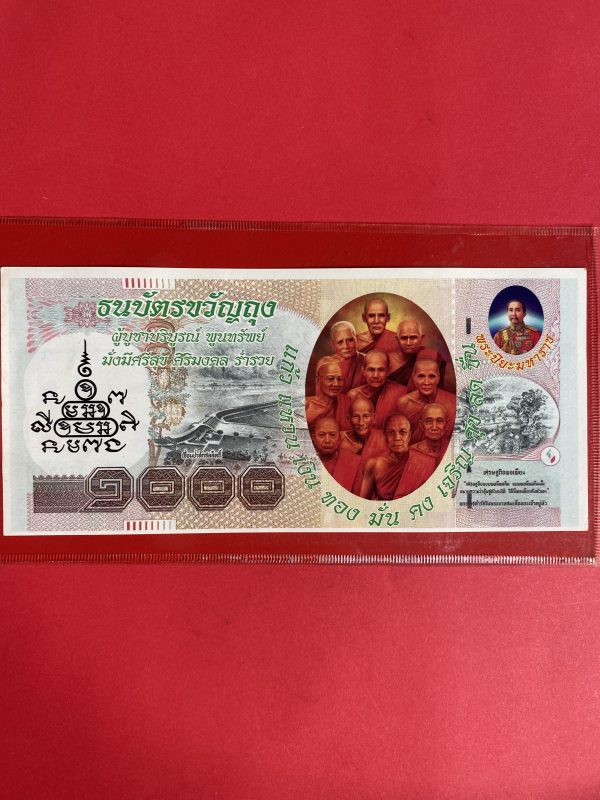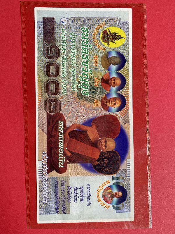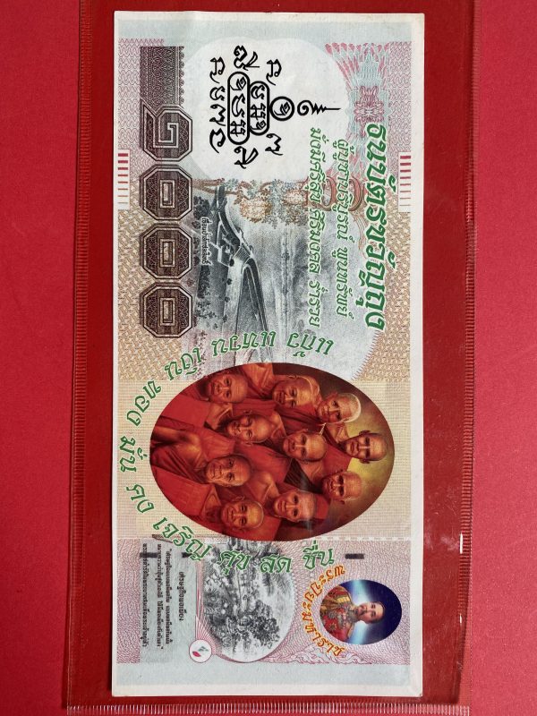 ธนบัตรขวัญถุงราคา 1,000 บาท ผู้บูชาบริบูรณ์ พูนทรัพย์ แก้ว แหวน เงิน ทอง มั่น คง เจริญ ศุข สด ชื่น มีคาถาเรียกเงิน ( ชอบ เงิน สด )