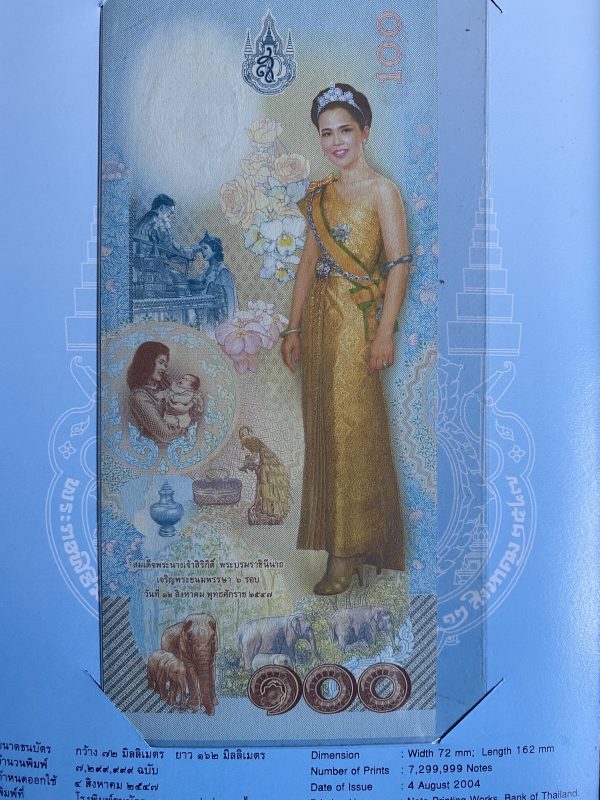 ธนบัตรที่ระลึกพระนางเจ้าสิริกิต์ มหามงคลเฉลิมพระชนมพรรษา 6 รอบ 12 สิงหาคม 2547 ฉบับละ 100 บ.อยู่ในกรอบเดิม