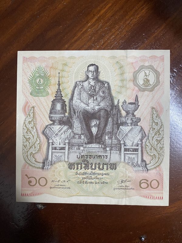 ธนบัตรธนาคารที่ระลึก ในหลวง ร.9 พระชนมพรรษาครบ 5 รอบ ออกวันที่ 5 ธันวาคม 2530 ฉบับ ราคา 60 บ.สภาพUNC