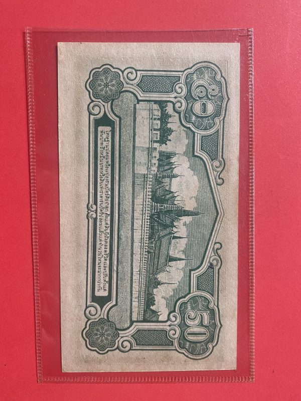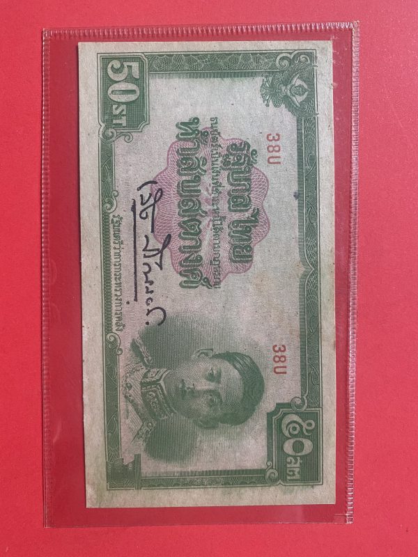 ธนบัตรแบบ 5 50 สตางค์ รุ่นที่ 1 ร.8 ประกาศใช้ 16 เม.ย. 2485 ลายเซ็น เล้ง ศรืสมวงศ์ พิมพ์ที่โรงพิมพ์ธนบัตร กระทรวงการคลังญี่ปุ่น
