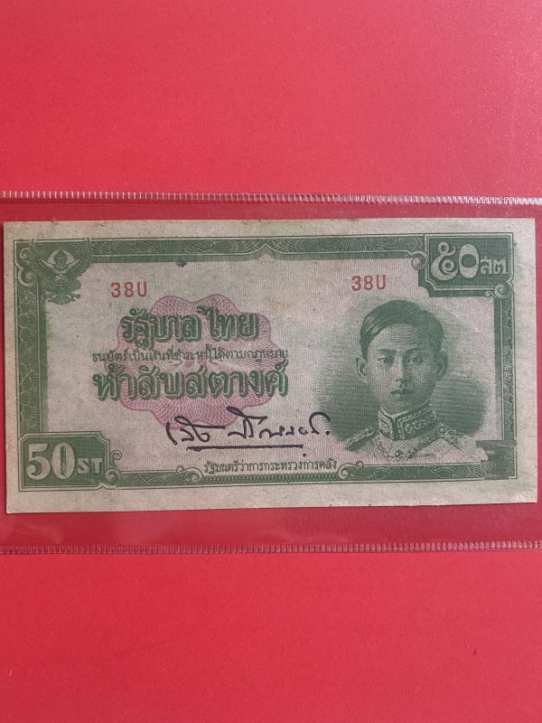 ธนบัตรแบบพิเศษ 50 ส.ต.รุ่นที่ 4 ร.8 (ไทยถีบ) ประกาศใช้ 30 มี.ค.2489 ลายเเซ็น ศรีวิสารวาจา พิมพ์ที่ โรงพิมพ์ญี่ปุ่นที่ เกาะชวา อินโดฯ