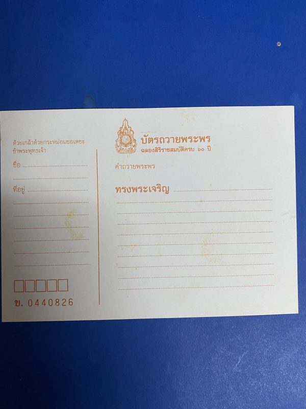 บัตรถวายพระพร ฉลองสิริราชสมบัติครบ 60 ปี รัชกาลที่ 9 สภาพใหม่เก่าเก็บ เลข 0440826