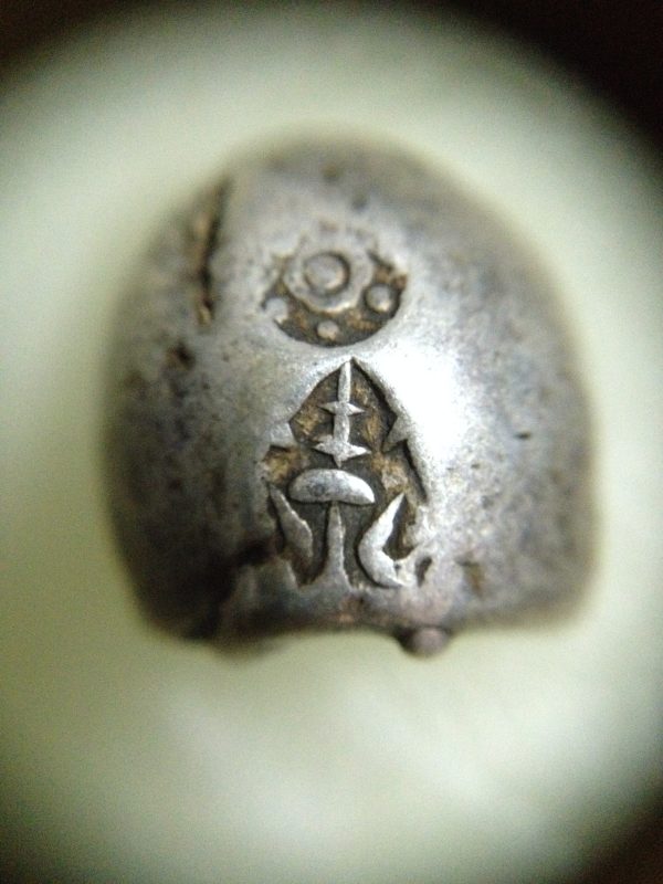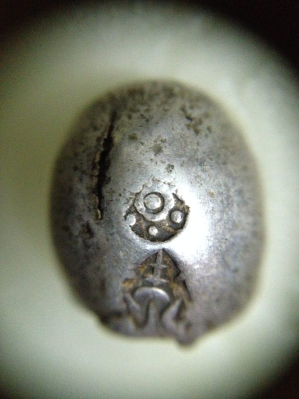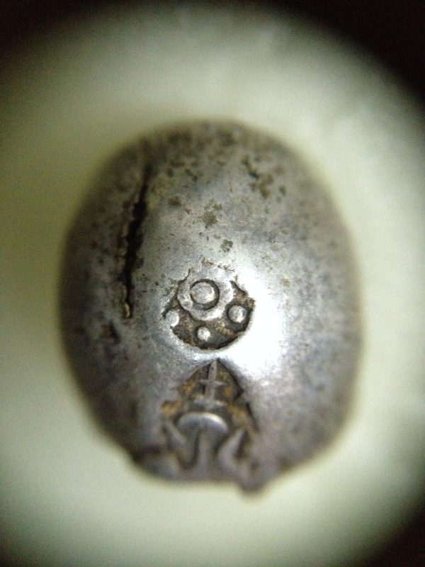 พดด้วงรัตนโกสินทร์เม็ดบาทสมัย ร. 4 พ.ศ.2394-2411 ( ตรามงกุฎ-กรงจักร ) เม็ดนี้พิเศษมี 3 ตรา (เม็ดที่ 2)
