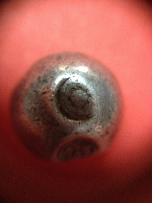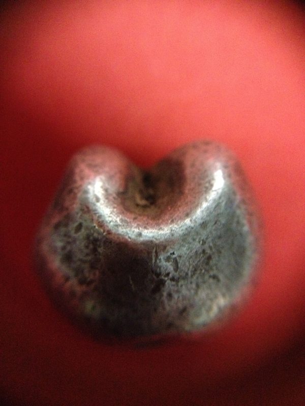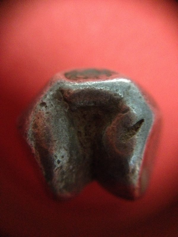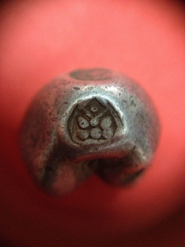 พดด้วงเม็ด 1 บาทสมัยพระนารายณ์ปี พ.ศ. 2199-2231 ตรา บัว หรือ พุ่มข้าวบิณฑ์ใต้จุดบนมีเส้นสองแฉก สวยคมชัด (เม็ดที่ 1)