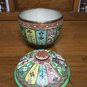 โถกระเบื้องเบญจรงค์สมัยอยุธยาตอนปลาย(รัตนโกสินทร์ตอนต้น) พร้อมฝา ลายกระจก สภาพค่อนข้างสมบูรณ์มีร้าว2เส้น ซ่อมสีที่เห็นภายในเล็กน้อย
