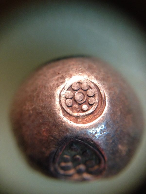 พดด้วงเม็ด 1 บาทสมัยพระเจ้าปราสาททองปี พ.ศ. 2173-2198 ตรา พุ่มข้าวบิณฑ์จอมปราสาท เป็นรูป 7 จุดอยู่ภายในกรอบ สวยคมชัดมากๆ (เม็ดที่ 1)