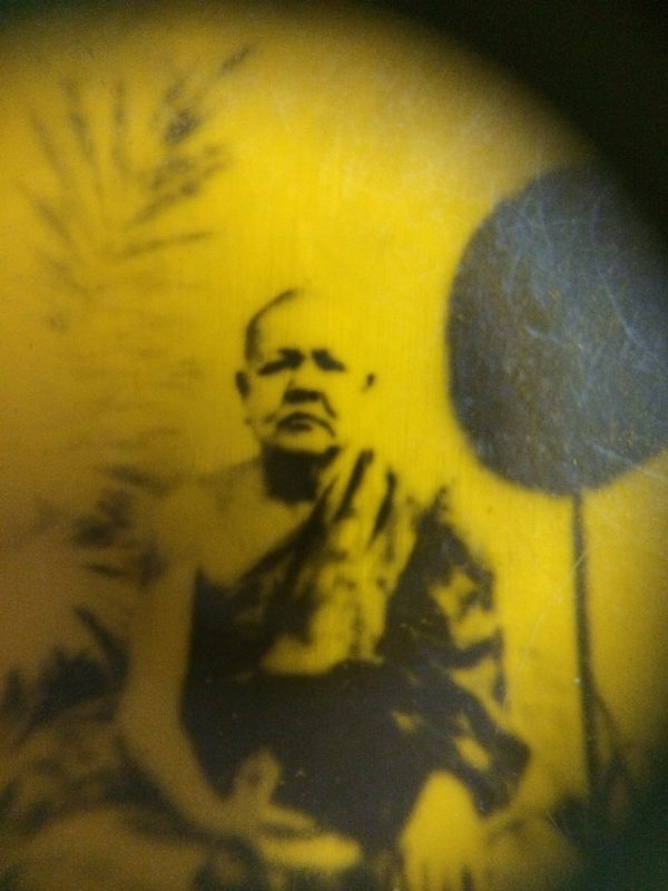 ภาพถ่ายเก่าหลวงพ่อนุ้ยวัดคุ้งยางเลี่ยมอยู่ในกรอบพลาสติกสีพร้อมแขวนคอ