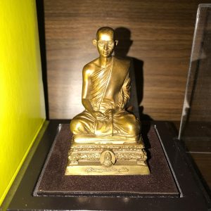 องค์หล่อในหลวงทรงผนวชขนาด 2" รุ่นพลังแผ่นดิน ปี 2554 พร้อมฐานไม้และครอบพลาสติกใสอย่างดี อยู่ในกล่องกระดาษแข็งสีเหลืองจากวัด