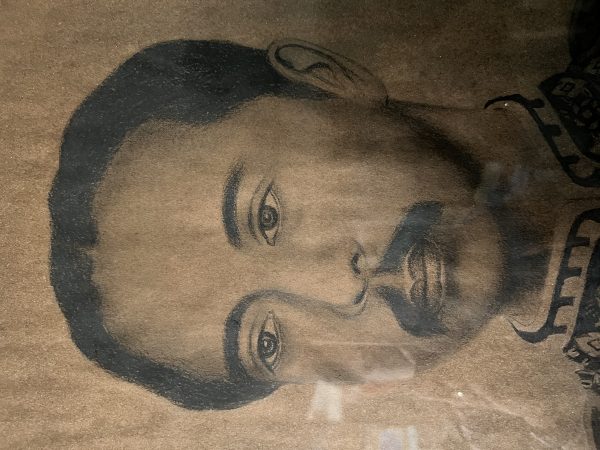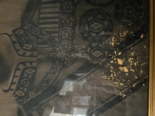 รูปวาดเสด็จพ่อ ร.5 แบบไรเงาด้วยดินสอเก่าบานใหญ่ เหนือรูป มีปั้มตราครุฑสีแดงเดิม และมีปิดทองไว้อยู่ด้านข้างและด้านล่าง