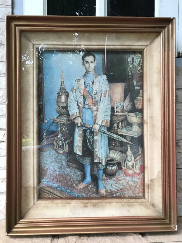 รูปวาดในหลวงปริ้นบนผ้ากำมะหยี่ สวมชุดครุยกษัตริย์ ถือดาบ อยู่ในกรอบไม้เก่า ขนาด กว้าง 23 1/2 ” X สูง 29 1/2 ‘”สวยงามคลาสสิก