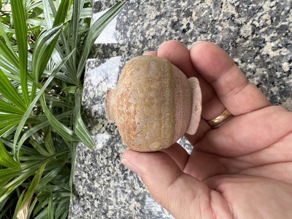 สังคโลกเก่ารูป ทรงโอ่งนำ้ปากแคบคล้ายศิลปะสุโขทัย ชนิดดินเผาโบราณไม่มีลวดลายใบเล็กจิ๋ว สภาพสวยสมบูรณ์