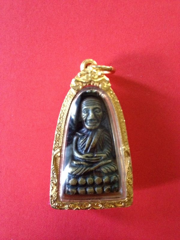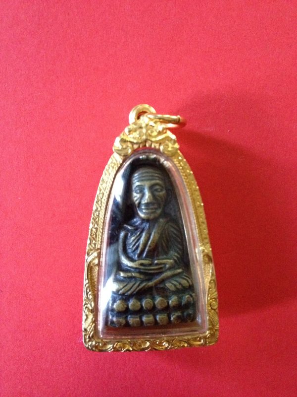 หลวงปู่ทวดพิมพ์เล็กหลังหนังสือทองเหลืองรมดำ เลี่ยมทองคำอย่างหนาแกะลายยกซุ้ม