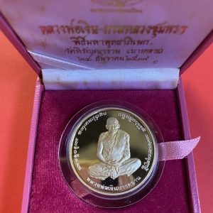 เหรียญหลวงพ่อเงินบางคลาน หลังกรมหลวงชุมพรฯ เนื้อเงินบริสุทธิ์ขัดเงาออกวันที่ 28 ธันวาคม ปี 2537 กล่องกำมะหยี่สีชมพูเดิม