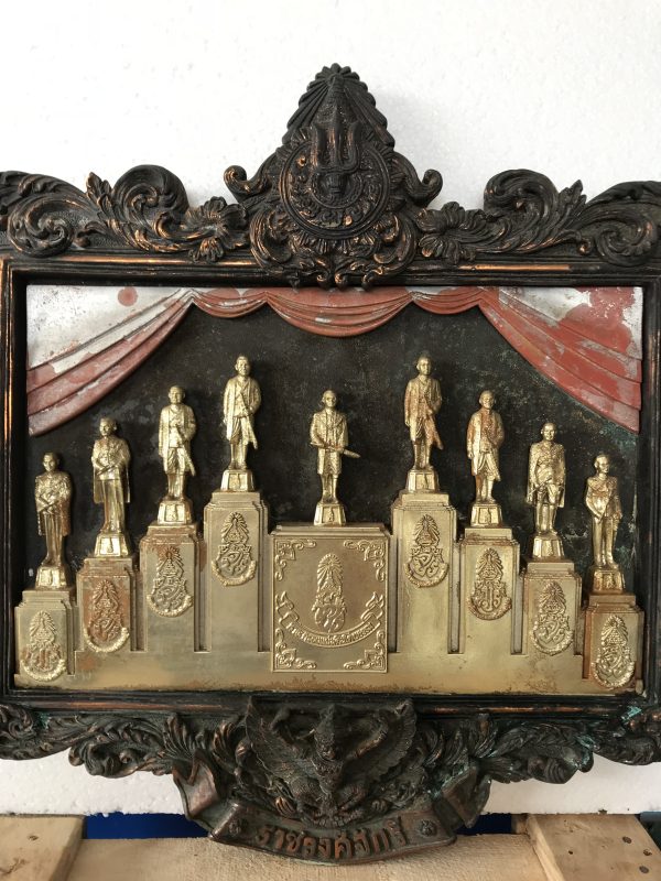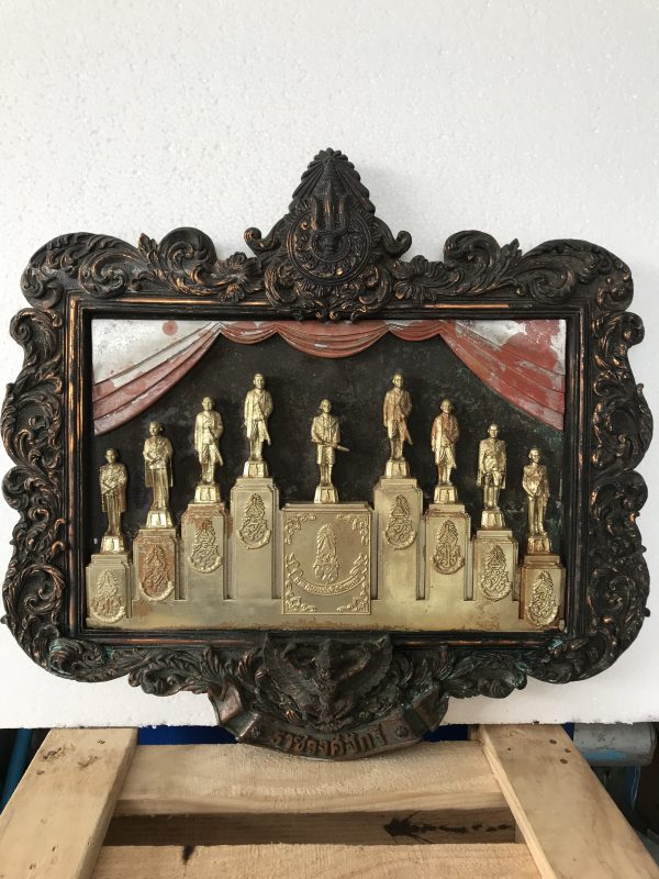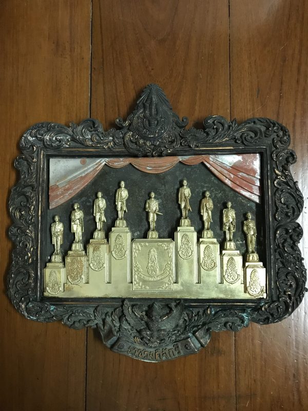 องค์หล่อในหลวงยืนอยู่บนแท่น 9 รัชกาล อยู่ในกรอบโลหะด้านบนเป็นตรามงกุฎครอบตรี ด้านล่างมีครุฑ ด้านใต้เขียนว่า ราชวงศ์จักรี