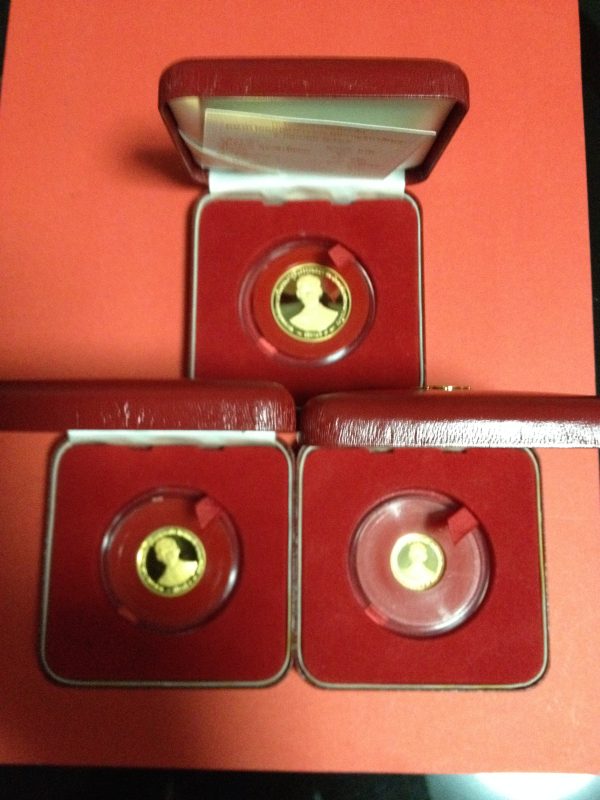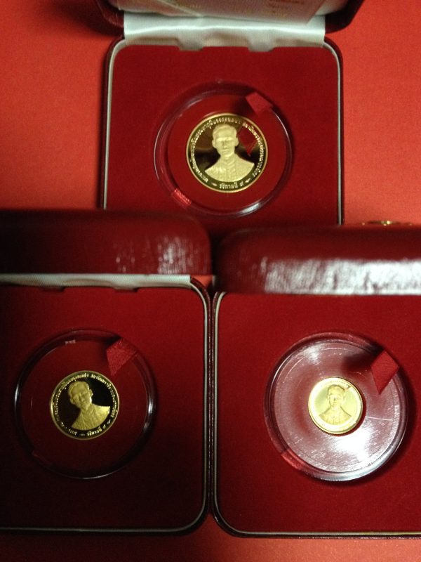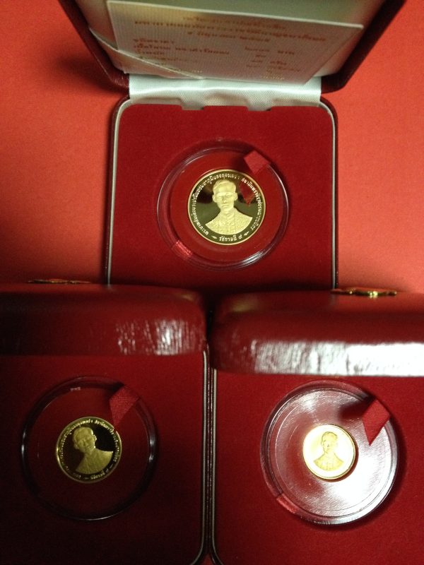 เหรียญกษาปณ์ที่ระลึก พระราชพิธีกาญจนาภิเษก ปี 2539 ชุด3เหรียญ เนื้อทองคำขัดเงา นำ้หนักรวม 26.6 กรัม พร้อมกล่องกษาปณ์
