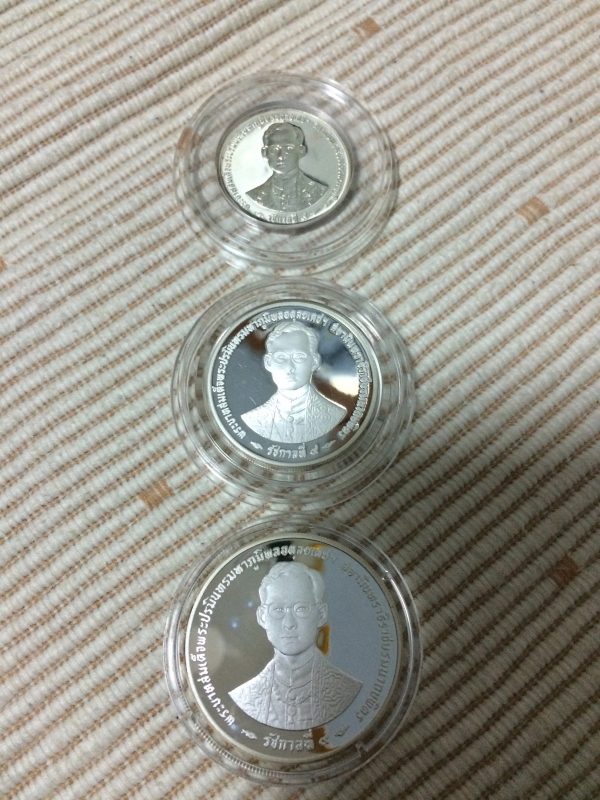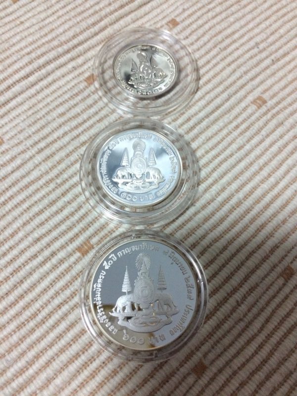 เหรียญฉลองสิริราชสมบัติครบ 50 ปี กาญจนาภิเษก 9 มิถุนายน 2539 เนื้อเงินแบบธรรมดาครบชุด 3 เหรียญ