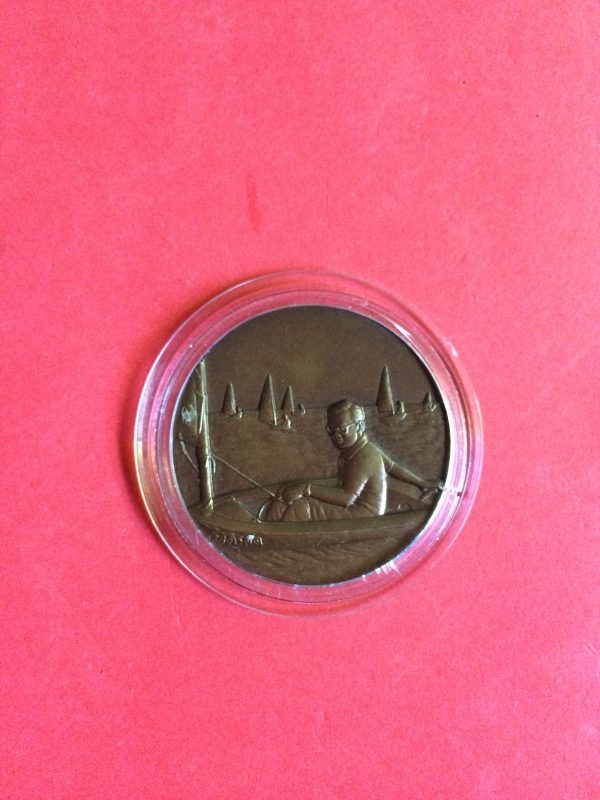 หน้าเหรียญเป็นรูปพระองค์ท่านประทับเรือใบ ซุปเปอร์มด ที่กรุงเทพมหานคร