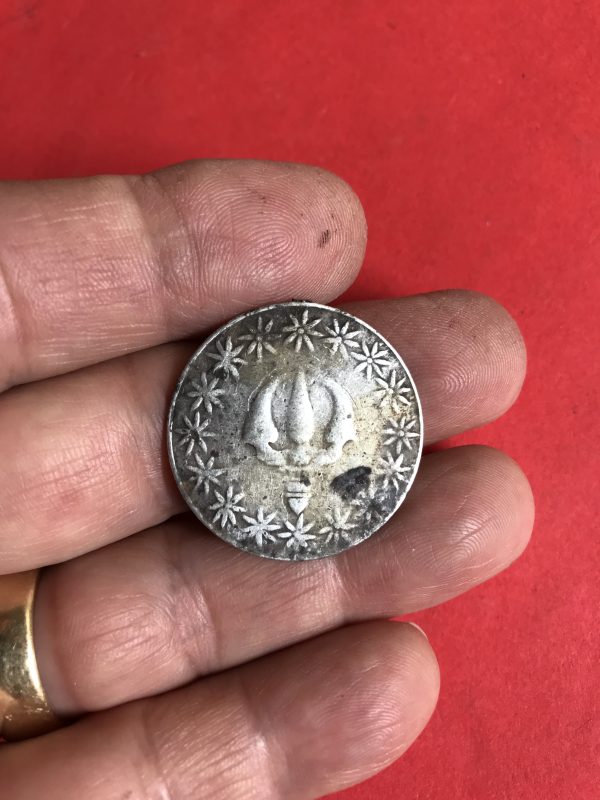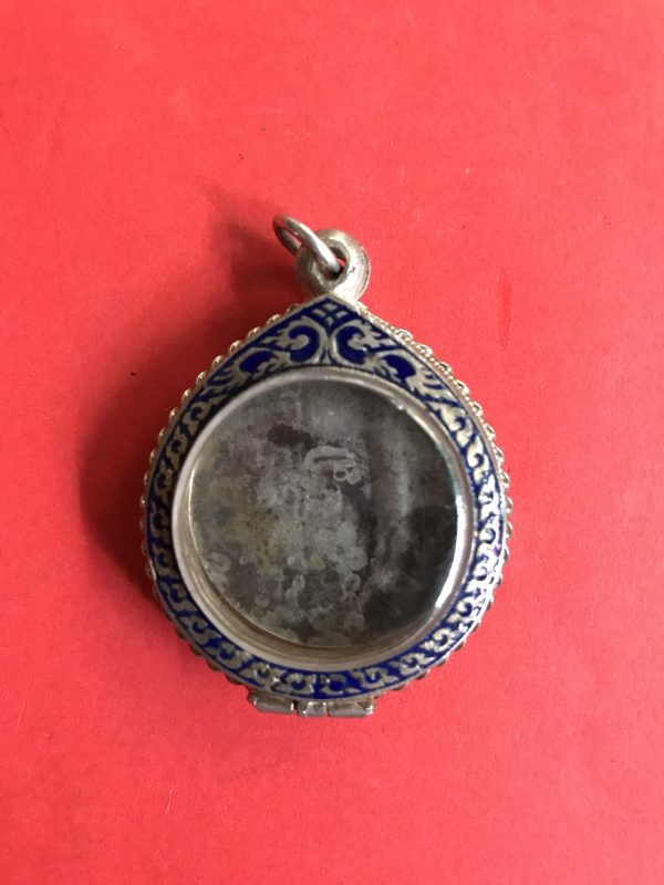 เหรียญที่ระฤกในการบรมราภิเษก( ตราสามง่าม )ในรัชกาลที่ 6 เนื้อเงินห่วงเชื่อม ร.ศ.130 พ.ศ.2454 พร้อมตลับเงินโบราณลงยาเปิดฝาได้