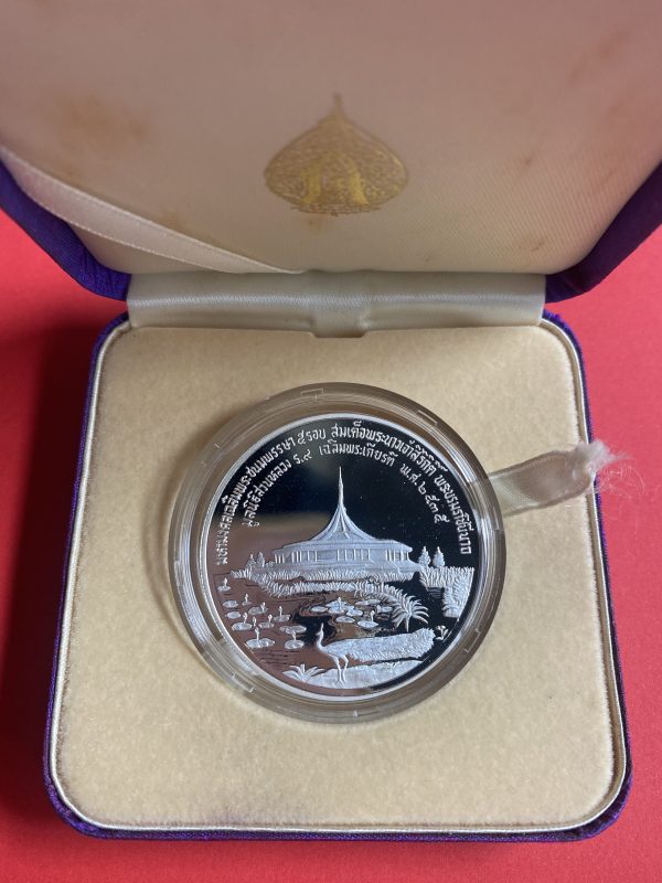 เหรียญที่ระลึกสวนหลวงร.9 ในหลวง – ราชินี เนื้อเงินขัดเงา ปี 35 หนัก31.5 กรัม ผลิต 1,000 เหรียญ สผ.ประมาณ 4 ซม.พร้อมกล่องเดิม