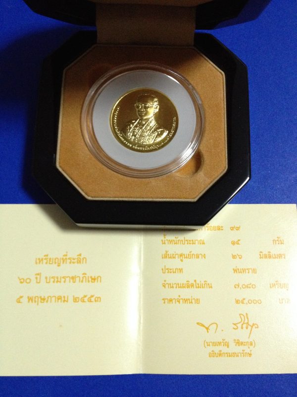 เหรียญที่ระลึก 60 ปี บรมราชาภิเษก ทองคำ 99% ออกวันที่ 5 พฤษภาคม 2553 ทองคำ เนยื้อทอง 99% ผลิตเพียง 7,080เหรียญ