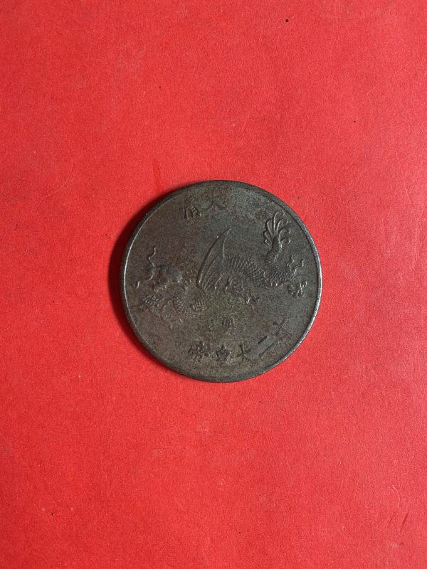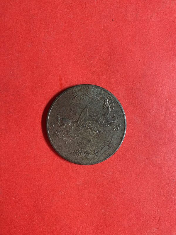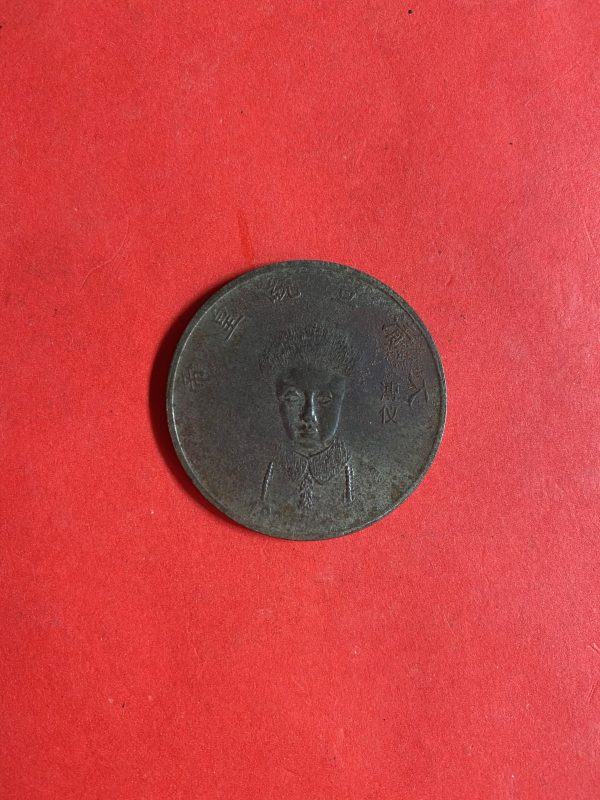 เหรียญประเทศจีนเนื้อทองแดงใหญ่ ด้านหลังเป็นรูปมังกรและด้านหน้ากษัตริย์หญิงสวย พอชัด