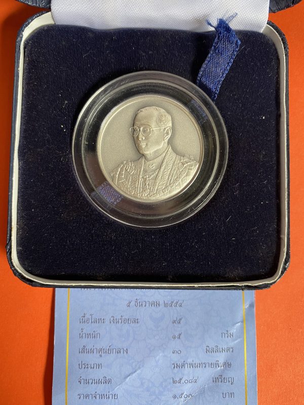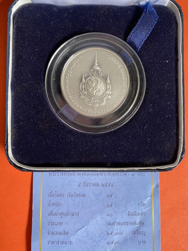 เหรียญพระราชพิธีมหามงคลเฉลิมพระชนมพรรษา 7 รอบ เนื้อเงินพ่นทราย 5 ธันวาคม 2554 พร้อมกล่องและใบ