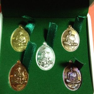 เหรียญหลวงพ่อคูณ เนื้อนวะ ปี 2517 บล็อก 5 แตกหน้าเกลี้ยง ( เป็นบล็อกหายากสุด ) เลี่ยมทองคำเก่าหนายกซุ้ม
