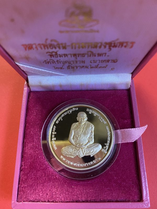 เหรียญหลวงพ่อเงินวัดบางคลานหลังกรมหลวงชุมพรฯ ทองคำขัดเงา 99.99% นน.31.14 g รวมเลี่ยม นน.46 g โรงงานเพิร์ธ 24 ธค ปี 37