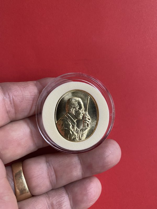 เหรียญในหลวงทรงวิทยุเนื้อทองคำ หรือเหรียญทรงวอ ของกรมไปรษณีย์ น้ำหนักประมาณ 18.4กรัม ปี 2539 สวยงามคมชัดหายากมากๆ ( ผลิตเพียง999เหรียญ )