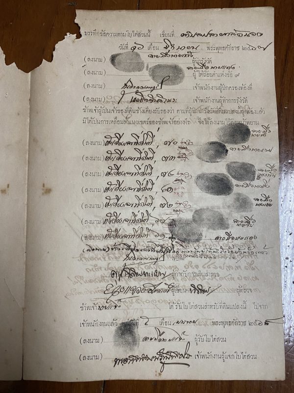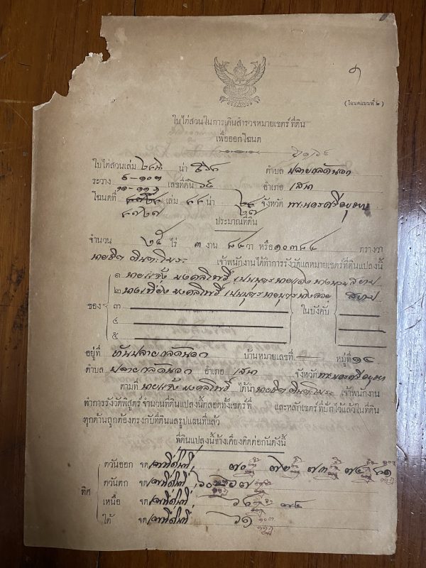 เอกสารเก่าเป็นใบไต่สวนในการเดินสำรวจหมายเขตร์ที่ดิน เพื่อออกโฉนด 16 มิย . 2467 ด้านหลังมีแสตมป์ฤชากรเก่ามากๆ 12 ดวง